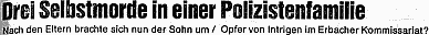 Rufmord betreiben." Zu diesem schweren Vorwurf schweigt seither der Behördenleiter - und sein Dienstvorgesetzter Horst Schnur! Der Landrat tritt auch nicht dem Eindruck entgegen, dass das skandalöse Vorgehen seiner Behörde in der intern als "brisant" angesehenen (Kriminal-)Sache von ihm gebilligt wurde oder gar mit ihm abgestimmt wurde - insbesondere der von seinem Mitarbeiter betriebene "Rufmord". Das andere Gesicht von "Landgraf" SchnurEs scheint, dass in dieser Sache ein anderes Gesicht bzw. das "nahezu allergisch" reagierende Gesicht des sich in der Öffentlichkeit jovial und verschmitzt zeigenden Odenwälder "Kartoffelkönigs" kenntlich wird. Öffentlich zu sehen ist dieses Gesicht des Horst Schnur (als "Zeuge") demnächst in einer Gerichtsverhandlung.Der "liberale", "weltoffene" Landrat hat auf eine wohlbegründete und unkonventionelle Dienstaufsichtsbeschwerde statt mit einer klärenden Anhörung bzw. einem klärenden Gespräch mit einem Strafantrag gekontert. Und dem, dessen Würde (und dessen [Mit]Eigentum) tatsächlich in nicht akzeptabler Weise angetastet wurde und der dies beim Namen nannte, liegt nun auf Betreiben von Schnur eine bizarre Anklageschrift wegen "Verleumdung" vor. Zumindest im Odenwald und unter Horst Schnur ist es also möglich, die Dinge und das Recht auf den Kopf zu stellen. Immerhin könnte dieser Prozeß zeigen, in welcher Weise Landrat Horst Schnur über den Persönlichkeitsrechten und auch über den Eigentumsrechten seiner Bürger wacht. Dabei könnte eine Praxis und ein Mangel an "Rechtssicherheit" erkennbar werden, die mit wohltönenden Proklamationen nichts mehr gemein hat - eigentlich ein Grund zum Trillern für idealistisch gesinnte junge Jusos. Drei Leichen im Keller des OdenwaldesGut 20 Jahre zuvor, im Sommer 1980, kostete die "Verteidigungsstrategie" eines wegen Verwahrungsbruch, Urkundenunterdrückung und Betrug angeklagten Odenwälder Behördenleiters (SPD) 3 Menschen das Leben.Sein als korrekt bekannter Stellvertreter, der ohne Ansehen der Person handelte und aussagte, das Gesetz also höher stellte als Beziehungen, Parteifreundschaften und Krähenprinzip, wurde mit Rufmord in die Verzweiflung getrieben. Er, seine Frau und sein 24-jähriger, eher alternativ eingestellter Sohn begingen nacheinander, innerhalb weniger Tage Selbstmord. Der junge Mann hatte im Zorn über die "schreiende Ungerechtigkeit", die seinem Vater in seinen Augen widerfahren war, zunächst den suspendierten Behördenleiter (Polizeichef) erschiessen wollen - und richtete die Waffe dann doch gegen sich selbst. Schlagzeile in OHZ vom 5.8.1980 Was der heutige Landrat Horst Schnur in einem aktuell brisanten Fall tut und unterlässt, um das Ansehen seiner Verwaltung zu "schützen", ist zum Teil bekannt. Was der damalige Landrat Dr. Baldur Nothhardt (SPD) mit Blick auf das Ansehen seiner Verwaltung tat und unterließ, ist nicht bekannt. Allerdings hatte sein heutiger Anwalts- und Kanzleikollege (SPD) seinerzeit den angeklagten Behördenleiter (SPD) in dem "Prozeß mit Blut und Tränen" verteidigt. Nach dem Selbstmord des von ihm vor Gericht "in die Mangel" genommenen Stellvertreters und Zeugen legte er sein Mandat nieder: Der Oberstaatsanwalt habe ihm nachgesagt, durch die Wahrnehmung seiner Aufgaben den Tod eines Menschen verursacht zu haben. Der Anwalt sah darin (und nicht in seiner Verteidigungsstrategie) eine allgemeine Verrohung der Sitten. Wie ein seltsamer Zufall erscheint es, dass 21 Jahre später, im August 2001, nochmals ein stellvertretender Polizeichef (Kripo) der Polizeidienststelle Erbach tot aufgefunden wird. Selbstmord. Es geht im Odenwald eben nicht nur idyllisch zu. |
