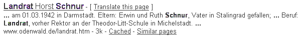 Parteien bei ihrer politischen Arbeit unterstützen." Muss die Odenwald - SPD der "braunen Gefahr" also auch in ihren eigenen Reihen entgegentreten? Oder ist alles wieder in Ordnung, wenn örtliche SPD-Mitglieder zwar rechtsextreme Auffassungen teilen, aber gefälligst nur noch die eigene Partei "bei ihrer politischen Arbeit unterstützen"? Sollte die Odenwälder SPD nicht nur ihre Proklamatik, sondern auch ihre Programmatik ernst nehmen, müsste sie freilich als erstes ihrer undemokratischen Parteibuchwirtschaft, einer milden, rosa-farbigen Form von Partei-Apartheid, ein Ende bereiten - und damit einen Ast absägen, auf dem sie seit Jahrzehnten sitzt, regiert und politisch dominiert. Denn eine so unangefochtene und andauernde Machtstellung sichert sich nur, wer bereit ist, Hinz und Kunz in die eigenen Reihen aufzunehmen, Hauptsache er dient dem Klüngel und gefährdet ihn nicht. So werden auch Mitglieder gesammelt, die nicht so sehr demokratische Überzeugungen teilen, sondern vielmehr all die Vorteile, die sich aus dem richtigen Parteibuch ergeben. Spagat von ganz links und jung nach ganz alt und rechtsBeispielhaft deutlich macht den breitesten, politischen Spagat der Odenwälder SPD ein Eintrag ihres obersten Herrn Horst Schnur im Internet-Gästebuch seiner Jusos am 13. 2. 2001:Hallo meine Lieben, das habt Ihr ja wirklich prima gemacht! So wird unser Odenwald auch politisch von seiner schönsten Seite wahrnehmbar. Nur bei den Bildern müßt Ihr noch nachsitzen: Schaut doch mal, wie ich das gelöst habe. Euer Horst Was genau Schnur mit der "politisch ... schönsten Seite" des Odenwaldes meint, bleibt unklar. Vielleicht die authentisch "sozialistischen Grüße" und das so bekannte, weltverändernde Marx-Zitat seines potenziellen Irgendwann-Nachfolgers Raoul Giebenhain . [Früh und sehr links übt sich, wer im Odenwald ein Meister bzw. Landrat wird.] Vielleicht auch "Der Funke", eine von den Jusos per Hyperlink hervorgehobene "Marxistische Zeitschrift in Sozialdemokratie und Gewerkschaften", welche nach den Anschlägen auf das World Trade Center auf ihrer Homepage plakativ und tiefschürfend feststellte: "TERROR IST DAS GESCHWÜR DER KAPITALISTISCHEN KRANKHEIT". Dazu zitieren die marxistischen Sozialdemokraten dann noch als höchste Autorität Leo Trotzki, den Organisator der Oktoberrevolution und der Roten Armee: "Wenn wir uns terroristischen Akten widersetzen, so n u r deshalb, weil individuelle Rache uns nicht zufriedenstellt." [Vor Ort, in Michelstadt, führte am 20.10.2001 eine gemeinsame "Antifaschistische Aktion" mit wirren Linksradikalen (AAO) zu einer späteren Randale betrunkener Anarchos, bei der ausgerechnet die historische Synagoge beschädigt wurde.] Schaut man dann die Internet-Seite an, die "Horst" seinen "Lieben" zur Nachahmung empfiehlt, können die jungen Jusos vom altgewordenen Ex-Juso nicht nur lernen, wie ein Bild in HTML integriert wird, sonder auch wie ein Image produziert wird: Verschmitzt, wie es seine Art ist, präsentiert sich der geübte Selbstdarsteller im traditionellen Ornat. So gefühlig, wie er dort noch die marxistischen Jungen ansprach, so gefühlig spricht er hier die heimatverbundenen Alten an. Und die Vaterlandsverbundenen. Die erfahren aus seinen sorgfältig gewählten und gesetzten "Persönlichen Daten", dass "Euer Horst" aus (r)echtem Holz geschnitzt ist: War der Vater doch offenbar ein Held von Stalingrad, der dort fürs Vaterland bzw. für Hitler sein Leben hingab. Mythos StalingradMan muss wissen, welchen Mythos die Nazis um die von ihnen verheizten "Helden von Stalingrad" schufen, um nach dem Kalkül zu fragen, welches Horst Schnur bei der öffentlichen Präsentation ("Stalingrad") eines privaten, familiären Schickals leitet. Eines Schicksals, das er mit vielen (Vaterlosen) seiner Generation teilt, die dies jedoch nicht zum Bestandteil politischer Public Relation machen. Wer in Google, der bedeutendsten Suchmaschine, Informationen zu Landrat Schnur sucht, findet den nachfolgenden Eintrag mit extrahierten Texten aus seiner Selbstpräsentation. ![]() Horst Schnur hätte diese persönlichen Infos zu seinen Eltern in seiner Privatsphäre belassen können (wie seine Kollegen dies zumeist tun), er hätte von seinem Vater auch schreiben können: "im Krieg gefallen" oder "in Rußland gefallen", denn für das Sterben gab es damals keine privilegierten Orte, die besser oder schlechter waren als andere. Aber vielleicht meint Horst Schnur doch, dass der Tod in Stalingrad rühmlicher war - und dass ein wenig von diesem Ruhm auf den Sohn abfallen könnte. Wie viele russische Kinder hatte damals ein deutscher Soldat beim Eroberungsmarsch nach Osten zu (Halb-)Waisen gemacht, bevor ihn selbst eine Kugel traf? Auf einer Website der Aachener Hochschul-Jusos lässt sich nachlesen, wie heikel solche (Stalingrad)-Reminiszenzen sein können. Otto Köhler, ein bekannter linker Publizist, der u.a. für "Die Zeit" und die Gewerkschaftszeitung "Metall" schrieb, setzt dort der Stalingrad-Heldensaga eine übersteigert-wütende Polemik entgegen: "Auch die berühmte 6. Armee war, wie die Hamburger